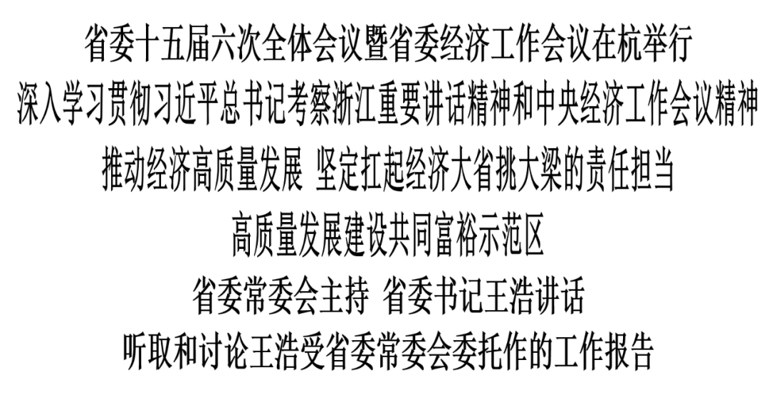 明年全省工作的总体要求是:坚持以习近平新时代中国特色社会主义思想为指导,全面贯彻落实党的二十大、党的二十届二中、三中全会精神和中央经济工作会议精神,深入学习贯彻习近平总书记重要讲话重要指示批示精神,深刻领会和准确把握明年经济工作的总体要求、政策取向和重点任务,牢牢把握工作主动权,坚定扛起“经济大省要挑大梁”的责任担当,忠实践行“八八战略”,紧扣“努力成为新时代全面展示中国特色社会主义制度优越性的重要窗口”、“高质量发展建设共同富裕示范区”、“奋力谱写中国式现代化浙江新篇章”等重大使命,以高质量发展为首要任务、以缩小“三大差距”为主攻方向、以改革创新为根本动力、以满足人民美好生活需要为根本目的,扎实推进“十项重大工程”,促进经济稳进向好、社会大局和谐稳定,确保“十四五”规划圆满收官,努力为全国大局多作贡献。21日,省委十五届六次全体会议暨省委经济工作会议在杭州举行。省委常委会主持会议。省委书记王浩讲话,省委副书记、代省长刘捷传达中央经济工作会议精神。会议坚持以习近平新时代中国特色社会主义思想为指导,全面贯彻党的二十大、党的二十届二中、三中全会精神和中央经济工作会议精神,深入贯彻落实习近平总书记考察浙江重要讲话精神,总结2024年省委常委会工作,重点研究部署2025年经济工作,进一步动员全省上下忠实践行“八八战略”、高质量发展建设共同富裕示范区、加快打造“重要窗口”、奋力谱写中国式现代化浙江新篇章。会议对2025年我省扩大有效投资“千项万亿”重大项目建设作具体部署。会议结束时,王浩就贯彻落实全会精神、做好岁末年初各项工作作了讲话。省发展改革委、省经信厅和义乌市、衢江区、松阳县、柯桥区、平阳县、瑞安市、上虞区、余杭区等8个县(市、区)负责人作交流发言。会议指出,今年以来,省委常委会团结带领全省上下,深入贯彻习近平总书记重要指示批示精神和党中央决策部署,坚持稳中求进工作总基调,完整、准确、全面贯彻新发展理念,始终以绝对忠诚之志、感恩之心,坚定不移沿着习近平总书记指引的方向奋勇前进,坚定拥护“两个确立”、坚决做到“两个维护”。持续抓好党的二十届三中全会精神和习近平总书记考察浙江重要讲话精神落地见效;坚决扛起经济大省挑大梁的责任担当,经济运行呈现“稳中有进、质效提升、积极因素增多”的良好态势;大力推动科技创新与产业创新,新质生产力发展势头良好;进一步深化改革开放,发展动力活力不断增强;持续缩小“三大差距”,共同富裕取得新进展;积极践行全过程人民民主,全过程人民民主实践高地加快打造;奋力推进高水平文化强省建设,文化软实力进一步提升;扎实推进绿色低碳发展和能源保供稳价,绿色发展水平不断提高;一体推进平安浙江法治浙江建设,社会大局保持和谐稳定;加强党的全面领导和全面加强党的建设,风清气正的良好政治生态不断巩固。这些工作成绩的取得,根本在于习近平总书记领航掌舵、在于习近平新时代中国特色社会主义思想科学指引,也是全省党员干部和广大群众埋头苦干、共同奋斗的结果。会议指出,当前外部环境变化带来的不利影响加深,经济运行仍面临不少困难和挑战,主要是消费回暖不快,创新发展能力不强,部分企业生产经营困难,风险隐患仍然较多,必须高度重视,认真研究,采取有效措施加以解决。会议认为,明年是“十四五”规划的收官之年,做好明年工作意义重大。要坚持以习近平新时代中国特色社会主义思想为指导,全面贯彻落实党的二十大、党的二十届二中、三中全会精神和中央经济工作会议精神,深入学习贯彻习近平总书记重要讲话重要指示批示精神,深刻领会和准确把握明年经济工作的总体要求、政策取向和重点任务,牢牢把握工作主动权,坚定扛起“经济大省要挑大梁”的责任担当,忠实践行“八八战略”,紧扣“努力成为新时代全面展示中国特色社会主义制度优越性的重要窗口”、“高质量发展建设共同富裕示范区”、“奋力谱写中国式现代化浙江新篇章”等重大使命,以高质量发展为首要任务、以缩小“三大差距”为主攻方向、以改革创新为根本动力、以满足人民美好生活需要为根本目的,扎实推进“十项重大工程”,促进经济稳进向好、社会大局和谐稳定,确保“十四五”规划圆满收官,努力为全国大局多作贡献。会议强调,做好明年工作,必须牢牢把握高质量发展建设共同富裕示范区这一核心任务,坚持整体推进、重点突破。必须牢牢把握“经济大省要挑大梁”的责任担当,更加积极有为、取得更好成效。必须牢牢把握“稳中求进、以进促稳,守正创新、先立后破,系统集成、协同配合”24字要求,整体把握、全面落实。必须牢牢把握始终“干在实处、走在前列、勇立潮头”的工作要求,探索新路径、增强新动能。